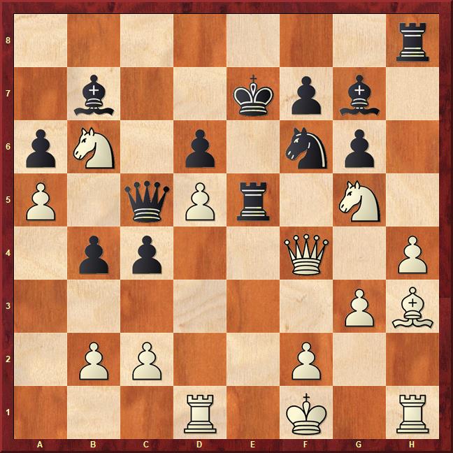 The solution is: 27.Nd7! Qc7 28.Nxe5 dxe5 29.Re1 Rd8 30.Rxe5+ Kf8 31.Re8+ 1-0