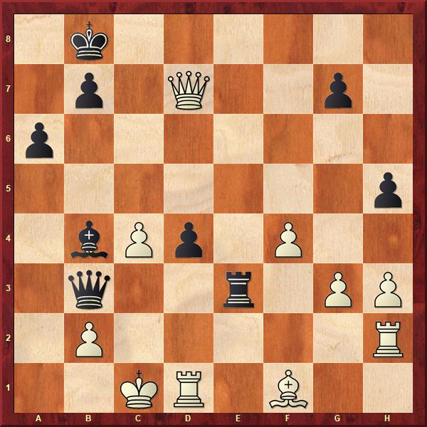 The solution is: 28…Rc3+ 29.bxc3 [29.Kb1 Qxd1+-+] 29…Ba3+ 30.Kd2 Qxc3+ 31.Ke2 Qe3# 0-1