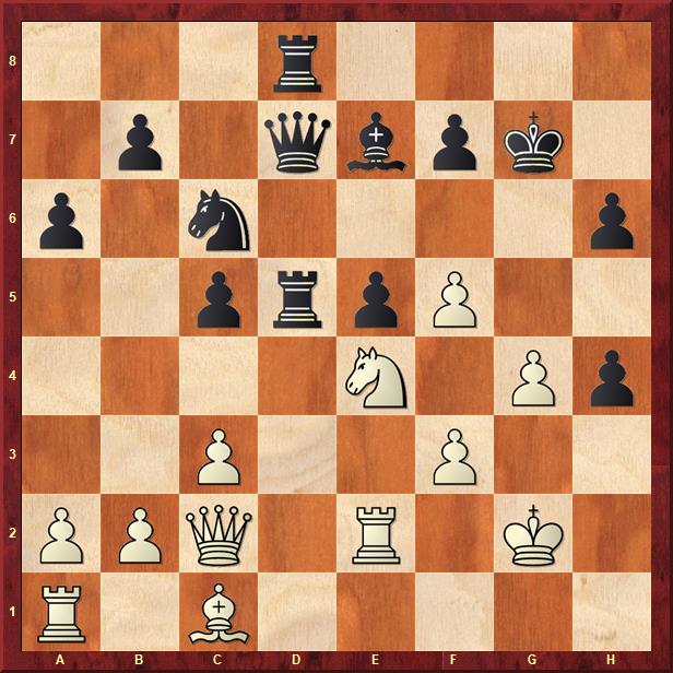 The solution is: 29.f6+ Bxf6 30.Bxh6+ Kxh6 31.Nxf6 1-0