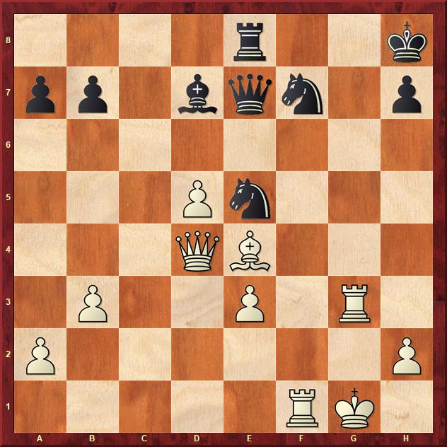 The solution is: 33. Bxh7 Kxh7 34. Rxf7+ 1-0