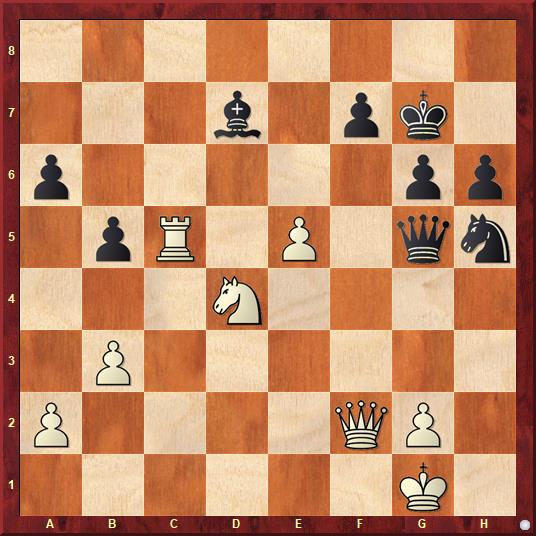 The solution is: 1. e6 Qxc5 2. Nf5+ Qxf5 3. Qxf5 1-0