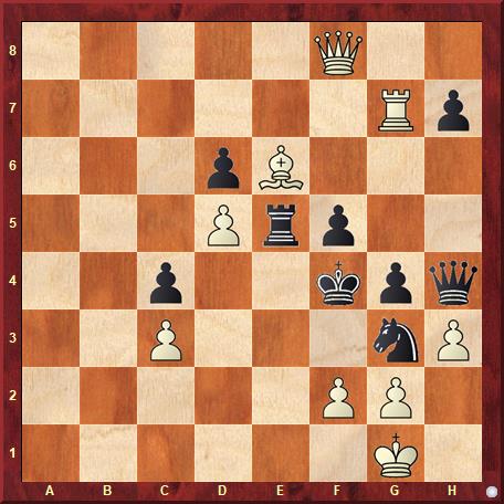 The solution is: 36. Rxg4+ Qxg4 37. Qh6+ Qg5 38. fxg3+ 1-0