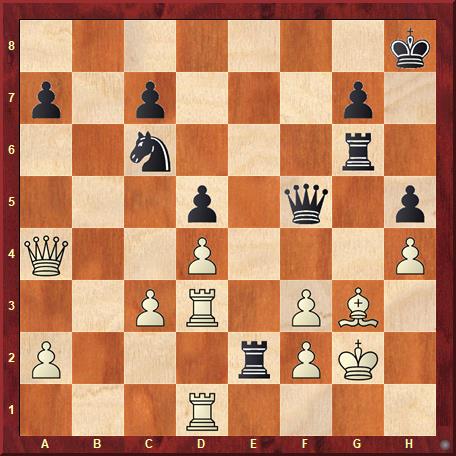 The solution is: 28… Rxg3+ 29. Kxg3 Qg6+ 30. Kf4 Qd6+ 0-1
