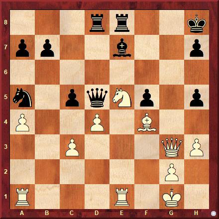 The solution is: 26. Ng6+ hxg6 27. Qxg6 Nc6 28. Re6 Qxe6 29. Qxe6 Bf8 30. Qxf5 cxd4 31. Qxh5+ Kg8 32. Bg5 1-0