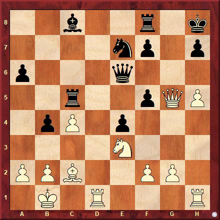 The solution is: 26. h6 Qe5 27. Rh5 Rg8 28. Ng4 1-0