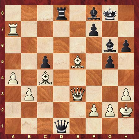 The solution is: 40. Qe4 Bxe4 41. Bxf7+ Kh7 42. Bd5+ 1-0