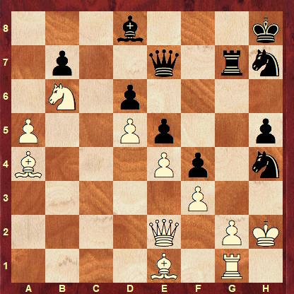 The solution is: 39… Rg3 40. Bxg3 Nf5 41. Rc1 fxg3+ 42. Kg1 Qh4 43. Qb5 Qh2+ 44. Kf1 Qh1+ 45. Ke2 Qxg2+ 0-1