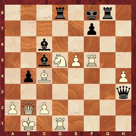 The solution is: 31. Rxf7+ Kxf7 32. e6+ Qxe6 33. Rf1+ Bf2 34. Rxf2+ 1-0