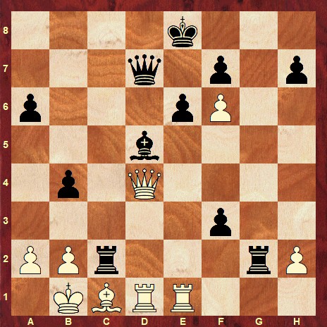 The solution is: 27… Rxc1+ 28. Kxc1 Qc6+ 29. Kb1 Qa4 30. Rd2 Bxa2+ 0-1