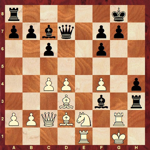The solution is: 23… Rh1+ 24. Kf2 Qh3 25. Reg1 Rxg1 26. Rxg1 Re8 27. Qb3 f5 28. Ng3 Qh2+ 29. Kxf3 Qxg1 30. Ne2 Qf1# 0-1