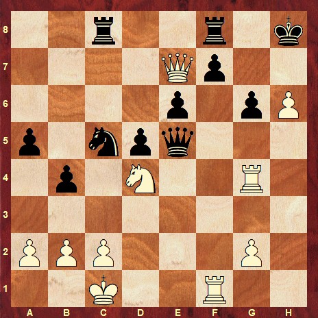 The solution is: 29. Nc6 Nd3+ 30. Kd2 Qxb2 31. Rd4 Rg8 32. Qf6+ Kh7 33. Qxf7+ Kh8 34. Qf6+ Kh7 35. Qe7+ Kh8 36. h7 Qc3+ 37. Ke2 Qxc2+ 38. Ke3 1-0