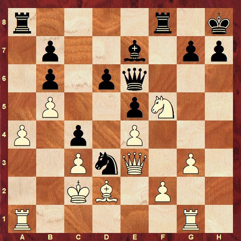 The solution is: 27… Rxf5 28. exf5 Qxf5 29. g4 Nb4+ 30. Kd1 Qc2+ 31. Ke1 Qb2 32. Rc1 Nd3+ 33. Ke2 Rf8 34. f3 e4 35. Rh1 d5 36. fxe4 Rf2+ 37. Kd1 Qb3+ 38. Rc2 Qb1+ 39. Rc1 Nxc1 40. Qxf2 Nd3+ 41. Ke2 Qxh1 0-1