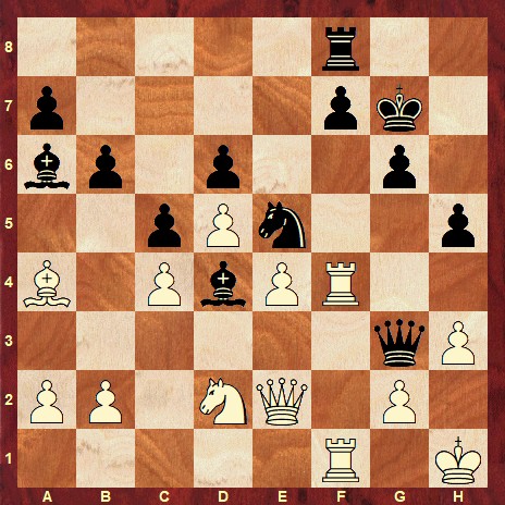 The solution is: 28… Ng4 29. Nf3 Qxf4 30. hxg4 hxg4 31. Nxd4 Qh6+ 32. Kg1 g3 33. Rxf7+ Rxf7 34. Nf3 Qc1+ 35. Qf1 Qxf1+ 36. Kxf1 Bxc4+ 37. Ke1 Bxa2 38. Ke2 Re7 39. Ng5 Bxd5 40. Kf3 Re5 0-1