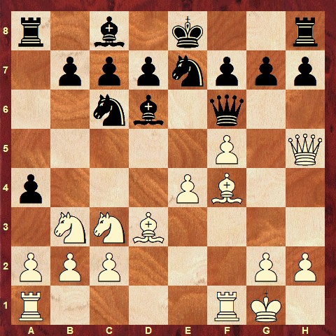 The solution is: 15. e5 Bxe5 16. Ne4 Qxf5 17. Nd6+ cxd6 18. Bxf5 axb3 19. Bxe5 Nxe5 20. Be4 bxa2 21. Qd1 Ra6 22. Bd5 Ra5 23. Bxa2 d5 24. Qe1 N5c6 25. b4 Rb5 26. c3 O-O 27. Qe2 Rb6 28. b5 1-0