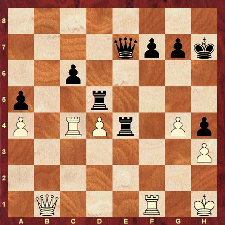 The solution is: 40… f5 41. gxf5 Rxf5 42. Rcc1 Qe6 43. Rfe1 Rff4 44. Rc3 g6 45. Rg1 Re2 46. Qb7+ Kh6 47. Qxc6 Rff2 0-1