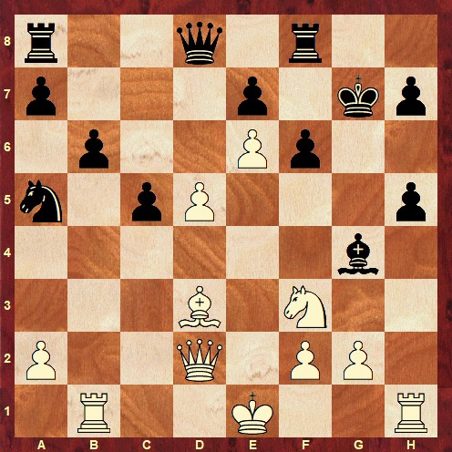 The solution is: 18. Ne5 fxe5 19. Qg5+ Kh8 20. Rxh5 Bxh5 21. Qxh5 Rf5 22. Bxf5 Qg8 23. Ke2 Qg7 24. Rh1 h6 25. Rh4 e4 26. Qxh6+ Qxh6 27. Rxh6+ Kg7 28. Rg6+ Kf8 29. Rg4 1-0