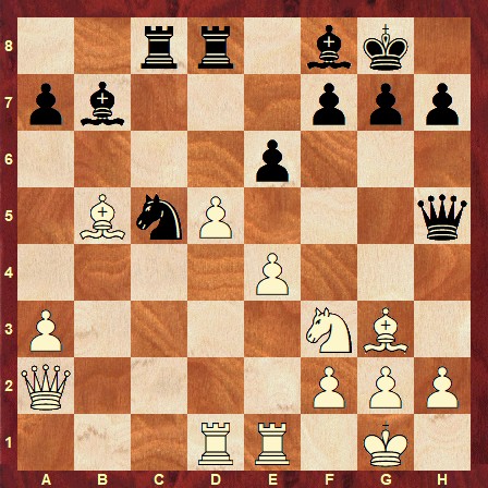 The solution is: 21… Nxe4 22. Rxe4 Rxd5 23. Rxd5 Bxd5 24. Rc4 Bxc4 25. Bxc4 Qd5 26. Nd2 Rxc4 27. Qxc4 Qxd2 28. h3 Bxa3 29. Qc8+ Bf8 30. Qa8 a5 31. f3 Qb4 0-1