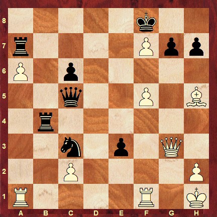 The solution is: 33. Ra5 Qxa5 34. Qd6+ Re7 35. f6 gxf6 36. Rg1 Qxh5 37. Qd8+ Kxf7 38. Qg8# 1-0
