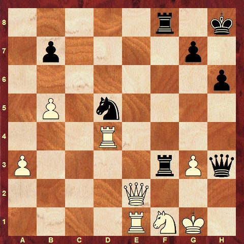 The solution is: 42… Rxg3+ 43. Nxg3 Qxg3+ 44. Kh1 Rf2 0-1