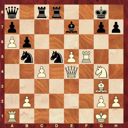 The solution is: 27… Nd4 28. Nh6+ gxh6 29. Qg4+ Bg5 30. Rxg5+ hxg5 31. Qxg5+ Kh8 32. cxd5 Rg8 33. Qf6+ Rg7 34. Rd1 Ne2+ 35. Kh1 Qxd5 0-1