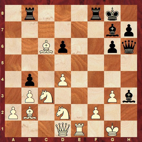 The solution is: 25… Rxf2 26. Kxf2 Bxd4+ 27. Kf3 Bg4+ 28. Ke4 Bxd1 29. Nxd1 Bxb2 30. Nc4 Qg5 31. Nde3 Qxg3 32. Rf1 Rf8 33. Bd5+ Kg7 0-1
