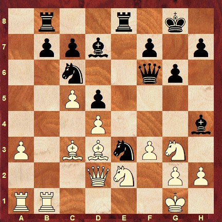 The solution is: 22… Bh3 23. gxh3 Qxf3 24. Nc1 Bxg3 25. hxg3 Qxg3+ 26. Kh1 Qxh3+ 27. Kg1 Qg3+ 28. Kh1 Re6 29. Nb3 g5 0-1