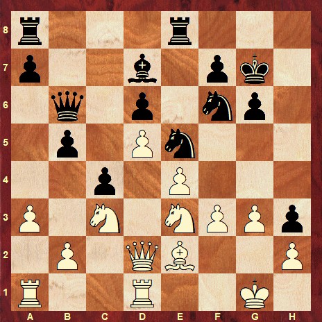 The solution is: 21… Neg4 22. fxg4 Nxe4 23. Qc1 Re5 24. Kf1 Rae8 0-1