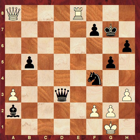 The solution is: 35… Nxh3+ 36. gxh3 Bd5 37. Rg8+ Kh7 38. Rh8+ Kg6 39. Qa6+ f6 40. Rxh6+ Kxh6 41. Qxf6+ Kh5 42. Kh2 Qe4 0-1