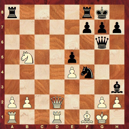 The solution is: 21… Bxg2 22. Bxg2 Qb6+ 23. Kh1 Qxb5 24. b3 h5 25. Bf1 Qb6 26. Bc4 Rfd8 27. Bd5 Kh8 28. Rg1 Ra5 29. Qc3 f6 30. b4 Ra7 31. Qc5 Qb8 32. Bc6 Rd2 33. a4 Nd3 34. Qe3 Nf2+ 35. Kg2 Qxb4 36. Rab1 Ng4+ 37. Kf3 Qd6 38. Rxg4 Rd3 0-1
