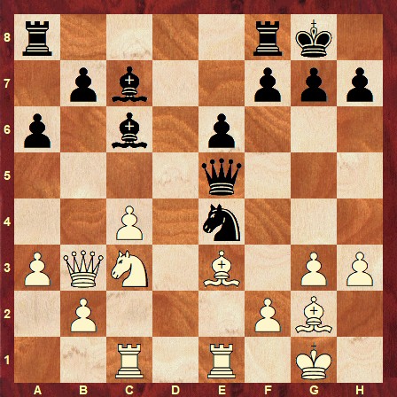The solution is: 22… Nxg3 23. fxg3 Qxg3 24. Qc2 f5 25. Bc5 f4 26. Qf2 Qg6 27. Bxf8 Rxf8 28. Qe2 Bb6+ 29. Kh1 f3 30. Qxe6+ Qxe6 31. Rxe6 fxg2+ 32. Kh2 Rf1 0-1