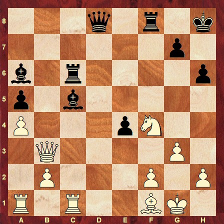 The solution is: 27… Bxf2+ 28. Kh1 Rb6 29. Qc2 e3 30. Bg2 Qe8 31. Qc5 Rff6 32. Rc2 g5 33. Nd5 e2 34. Qxa5 e1=Q+ 35. Rxe1 Qxe1+ 36. Qxe1 Bxe1 37. Nxb6 Rxb6 38. Rc6 Rxc6 39. Bxc6 Kg7 40. Kg2 Kf6 41. Bf3 Ke5 42. h4 Bc8 43. hxg5 hxg5 44. Kf1 Bxg3 45. b4 Kd4 46. a5 Kc4 47. a6 Bb8 48. Bb7 0-1