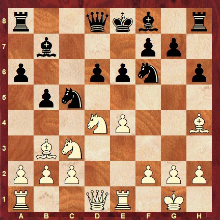 The solution is: 12. Bd5 exd5 13. exd5+ Kd7 14. b4 Na4 15. Nxa4 bxa4 16. c4 Kc8 17. Qxa4 Qd7 18. Qb3 g5 19. Bg3 Nh5 20. c5 dxc5 21. bxc5 Qxd5 22. Re8+ Kd7 23. Qa4+ Bc6 24. Nxc6 1-0