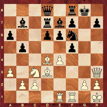 The solution is: 19. Nd5 Kg7 20. Rxf5 Bxd5 21. Rg5+ Kh8 22. Bxf6+ Bxf6 23. exd5 1-0