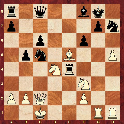 The solution is: 28. h6 fxe5 29. hxg7 Be7 30. Nxe5 Bd6 31. f4 Bxe5 32. fxe5 1-0