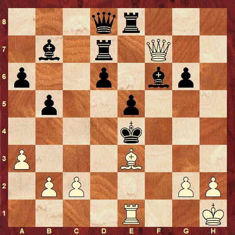 The solution is: 29. Qb3 Kf5 30. Rf1+ Kg4 31. Qd3 Bxg2+ 32. Kxg2 Qa8+ 33. Kg1 Bg5 34. Qe2+ Kh4 35. Bf2+ Kh3 36. Be1 1-0