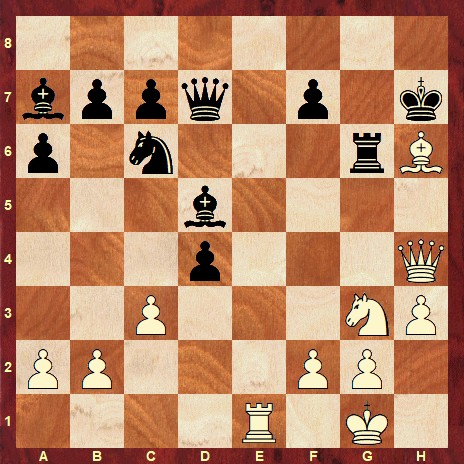 The solution is: 25. Bg5+ Kg8 26. Bf6 Rxf6 27. Qxf6 Bc5 28. Nh5 Bf8 29. Qg5+ 1-0