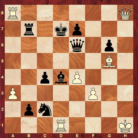 The solution is: 44… Kc6 45. Qe8+ Qd7 46. Qxg6+ e6 47. Ra6+ Kb5 48. Rxe6 Qh7+ 0-1