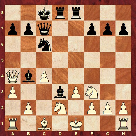 The solution is: 14… Qb6 15. axb4 Rxe3+ 16. Kd1 Be2+ 17. Kc2 Nxb4+ 18. Qxb4 Qg6+ 0-1