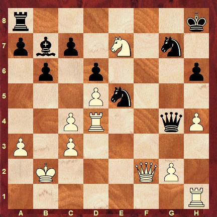 The solution is: 26. Re1 Qd7 27. Qf6 1-0