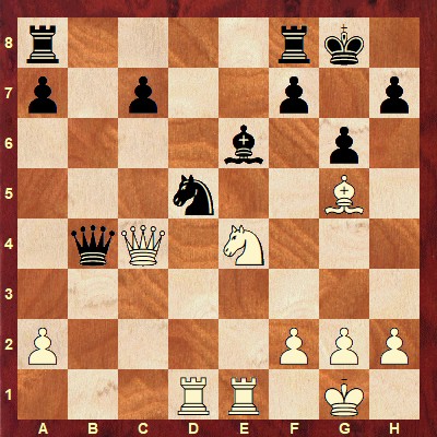 The solution is: 19. Nf6+ Kg7 20. Qc1 Nxf6 21. Qa1 Qe7 22. Rd7 1-0