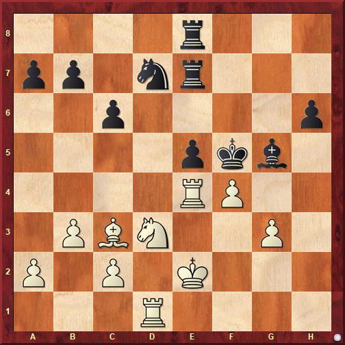 The solution is: 35. b7 Rg1+ 36. Kh3 Nef4+ 37. Kg4 h5+ 38. Kf3 1-0
