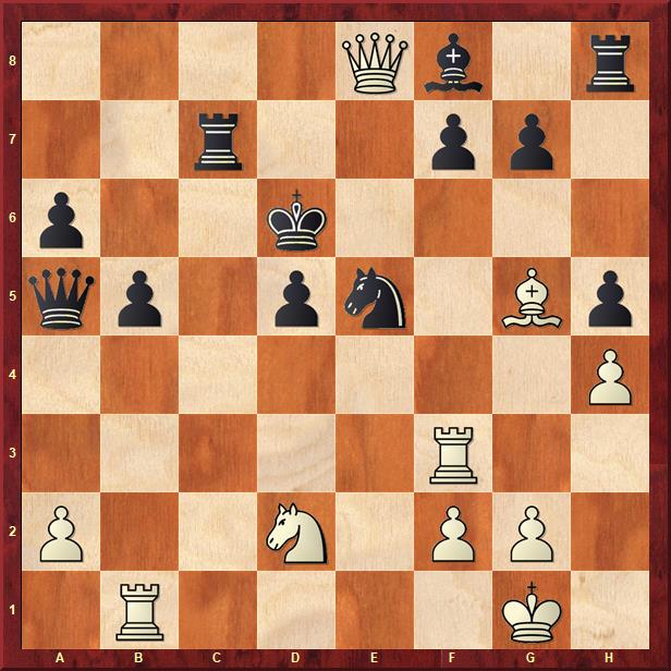 The solution is: 34…Nhf3 35.Nf2 Qh4+ 36.Kf5 Rf8+ 37.Kg6 Rf6+ 38.Kxf6 Ne4+ 39.Kg6 Qg5# 0-1