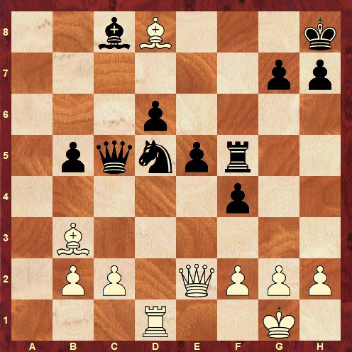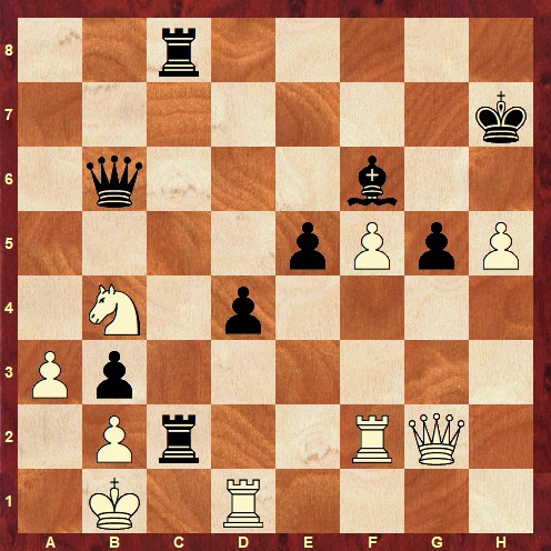 The solution is: 26. h6 Qe5 27. Rh5 Rg8 28. Ng4 1-0