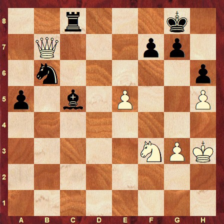 The solution is: 19. b4 Qd6 20. Rxe3 Na6 21. Bb2 Bg7 22. Nf6+ 1-0