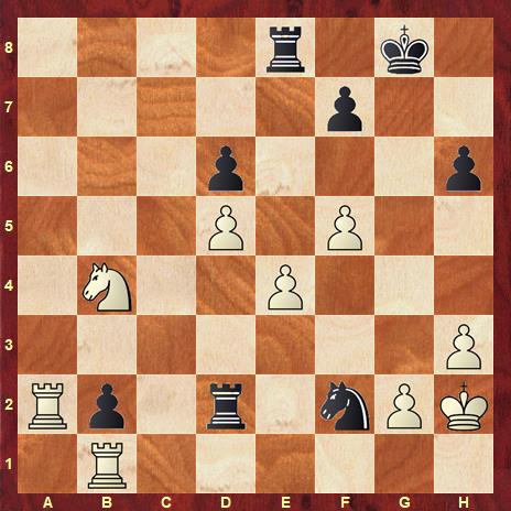 The solution is: 31… Nd2+ 32. Ka2 Qd5+ 33. b3 Qh1 34. a4 Qb1+ 35. Ka3 Qa1+ 36. Kb4 Qc3+ 37. Ka3 Nb1+ 0-1