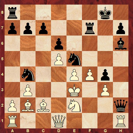 The solution is: 33… Rxh2 34. Qxb7 Qh5 35. g3 Rxc2 0-1
