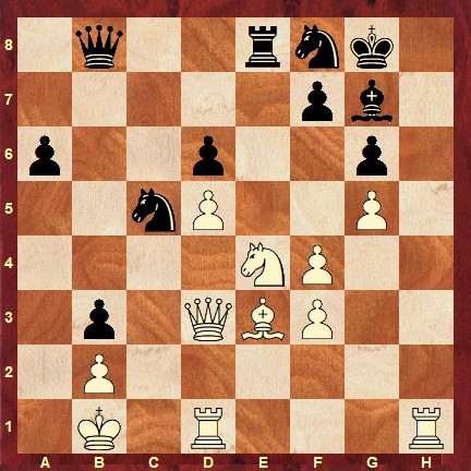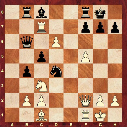 The solution is: 23. f6 g6 24. Nd5 Qxd6 25. Ne7+ Kh8 26. Bh6 1-0